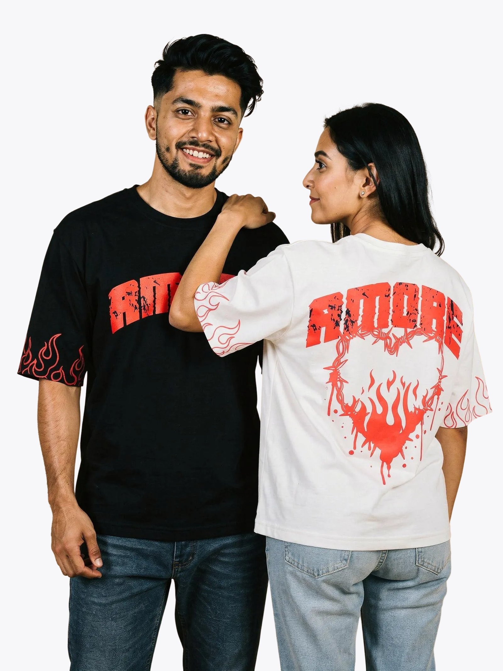 Bold. Intense. Unapologetic. The SLAYDRIP Black Flame Oversized T-Shirt is designed for men who move with confidence and attitude. Crafted from premium 220 GSM interlock cotton, this tee offers a structured, heavyweight feel while remaining breathable and comfortable for everyday wear. The front features distressed bold typography, while the back showcases a striking flame graphic enclosed in barbed-wire-inspired detailing — creating a strong streetwear aesthetic. Flame detailing on both sleeves enhances the design, giving it a complete 360° impact. The deep black base amplifies the red flame artwork, creating a sharp contrast that stands out effortlessly. As part of SLAYDRIP’s Couple Edition, this piece is designed to coordinate with the matching white women’s oversized version — forming a balanced black-and-white statement look that represents contrast, connection, and edge. Wear it solo for a bold street vibe or match it together for a standout couple aesthetic.