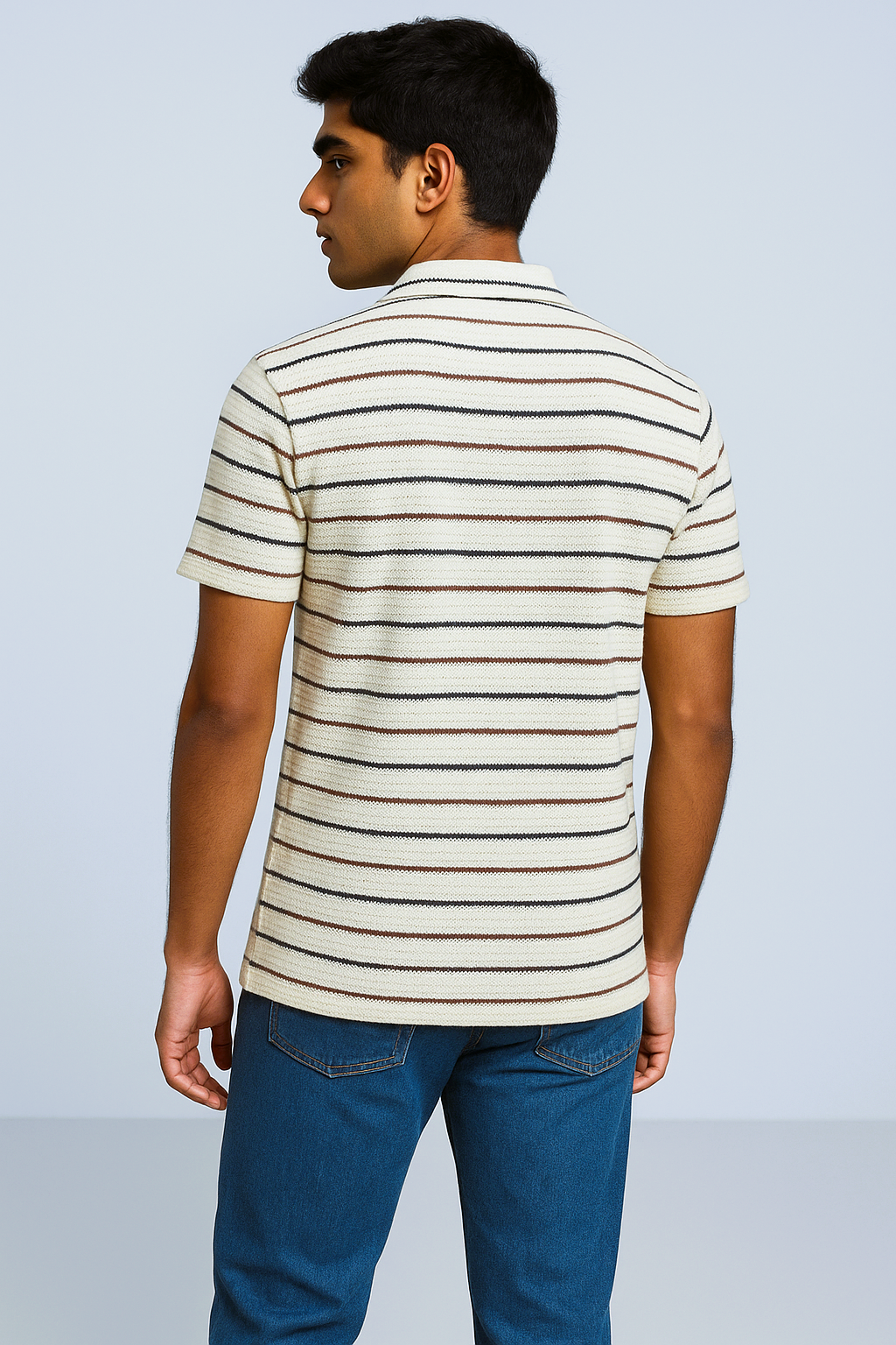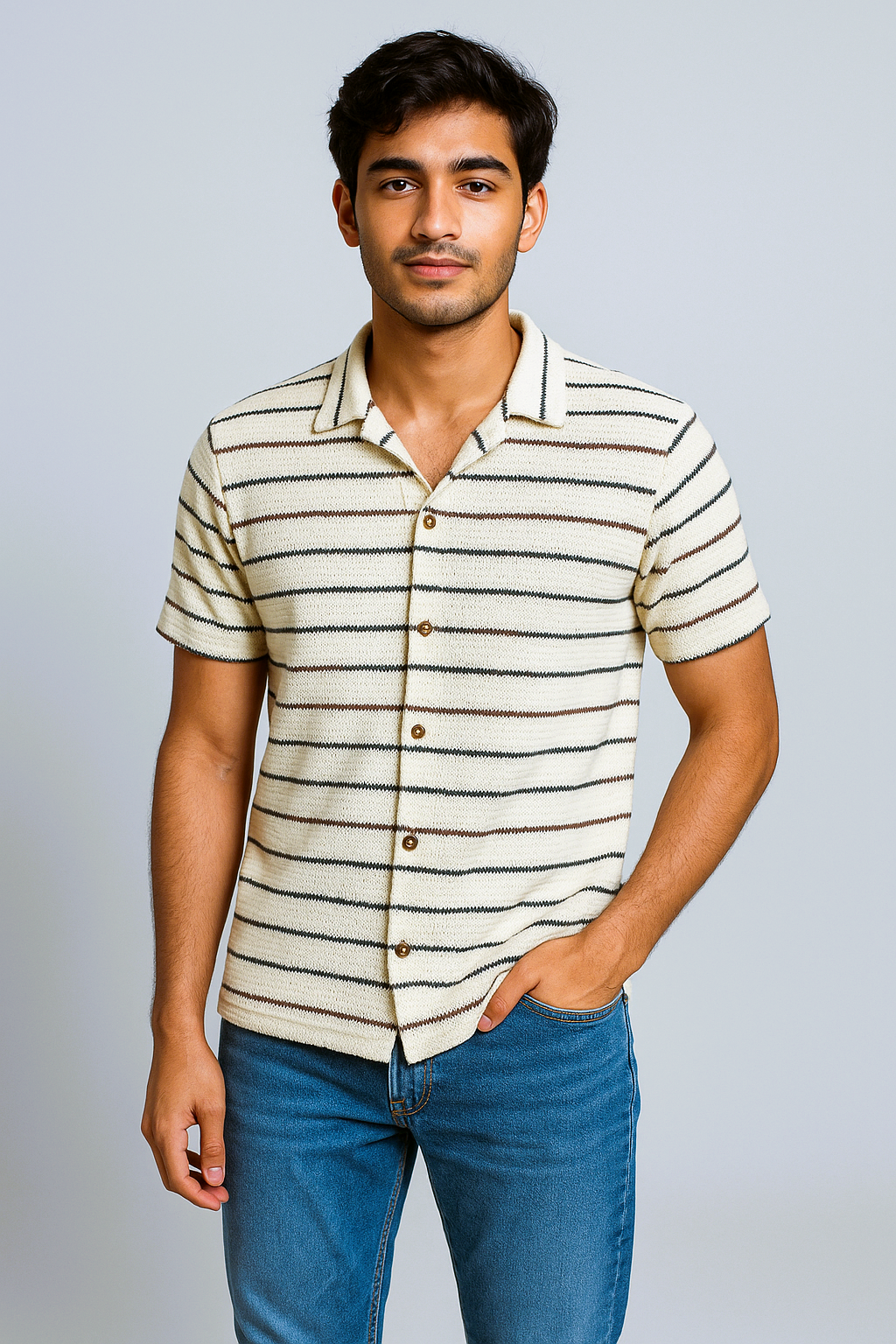 Subtle stripes, elevated comfort. The Textured Multi-Stripe Cream Shirt blends earthy tones with a premium textured feel — perfect for men who value style with ease. The soft knit-inspired texture creates a relaxed drape that flatters every body type. It’s the ideal shirt for effortless everyday dressing, giving your outfit quiet detail without overwhelming your look.